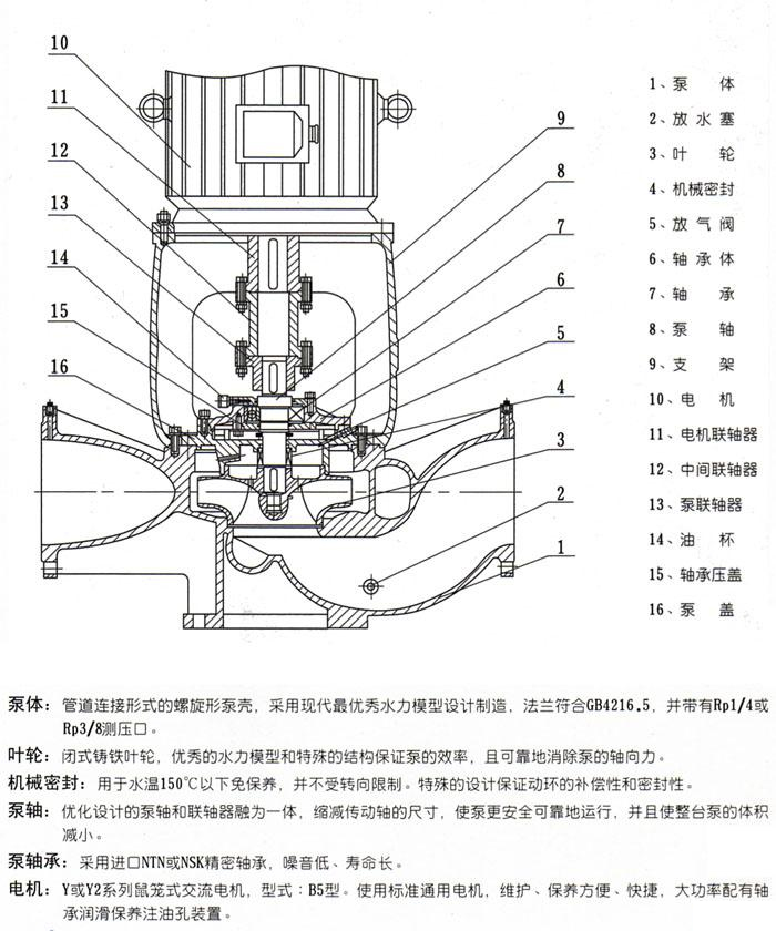 该立式管道泵特别是在整体结构上进行大胆突破设计。采用独立轴承体、泵轴支撑,解决了原来立式管道泵靠电机轴承支撑的不足之处;采用优秀水力模型的叶轮,消除了原立式管道泵轴向力大的不足之处;电机采用YE2,YE3等标准通用电机,解决原立式管道泵加长轴电机配套更换难的问题;另按照使用环境可选配普通电机(YE2,YE3)、防爆电机(YB3,YBX3,YBX4),变频电机(YVP系列)、变频防爆(YBBP系列)电机等电机品种;同时良好的便拆结构,解决了更换大功率水泵的轴承、机械密封、叶轮、泵轴的难题。上海管道离心泵厂家上海沈泉泵阀制造有限公司生产的管道离心泵与国内同类产品相比,具有运转更平稳、使用寿命长、配套更方便、维护保养更轻松等等,无可代替的优点。在立式管道离心泵系列产品中属GN前列,各项技术居GN领先,是替代ISG型立式管道泵、IS型离心泵、S型双吸管道离心泵等常规各种离心泵的理想产品。